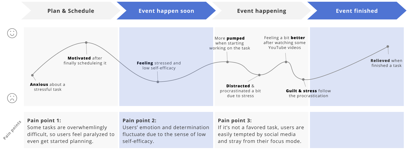 | 1. Plan & schedule | Tasks are overwhelming, feel paralyzed | ➡️ | Design needs to guide users through a step-by-step process to prepare for and break down difficult tasks | |