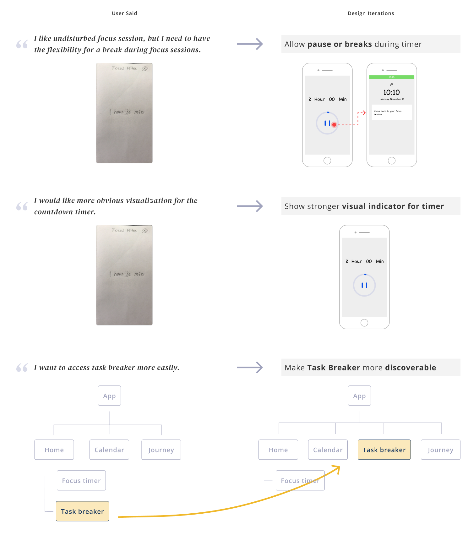 Based on key pain points, I created three design principles that prioritize user focus throughout their experience